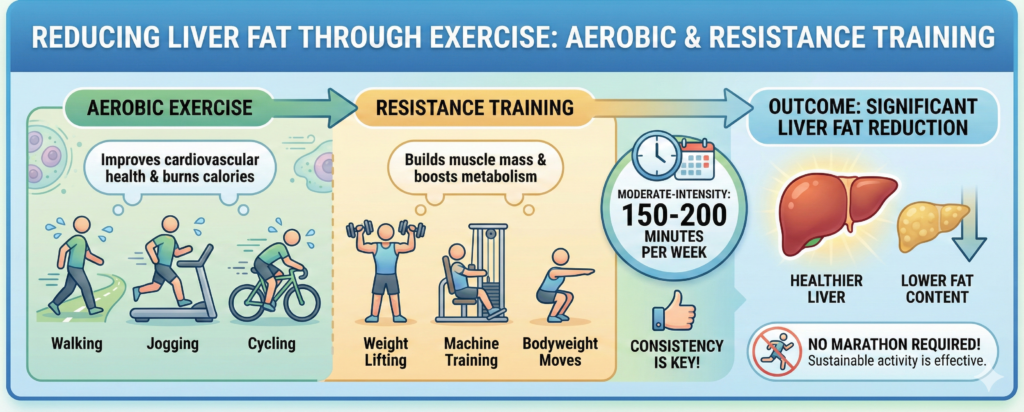 Studies have shown that both aerobic exercise like walking, jogging, or cycling and resistance training like weight lifting can reduce liver fat. You don’t need to become a marathon runner. Moderate-intensity exercise for 150-200 minutes per week has been shown to significantly reduce liver fat.